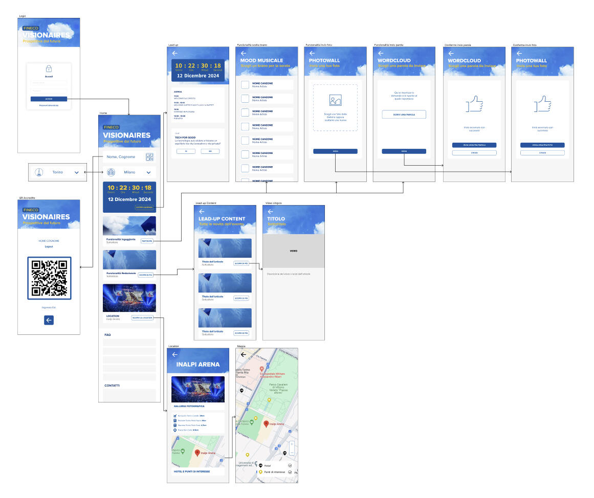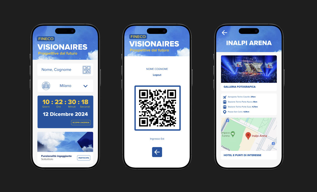 Il brief di questo progetto era abbastanza semplice, ma non per questo banale. Si trattava di realizzare un'applicazione dalla quale gli invitati all'evento potessero gestire interamente la loro esperienza, tra lead-up, raggiungimento della location, check-in e interazione con le esperienze e giochi proposti da Fineco. Per questo motivo ho deciso di progettare un design interamente modulare che potesse essere adattato in maniera semplice e veloce alle necessità dello specifico momento. Nel realizzare la parte estetica ho seguito le design guidelines del brand e utilizzato le loro icone, a parte alcune realizzate ad hoc.